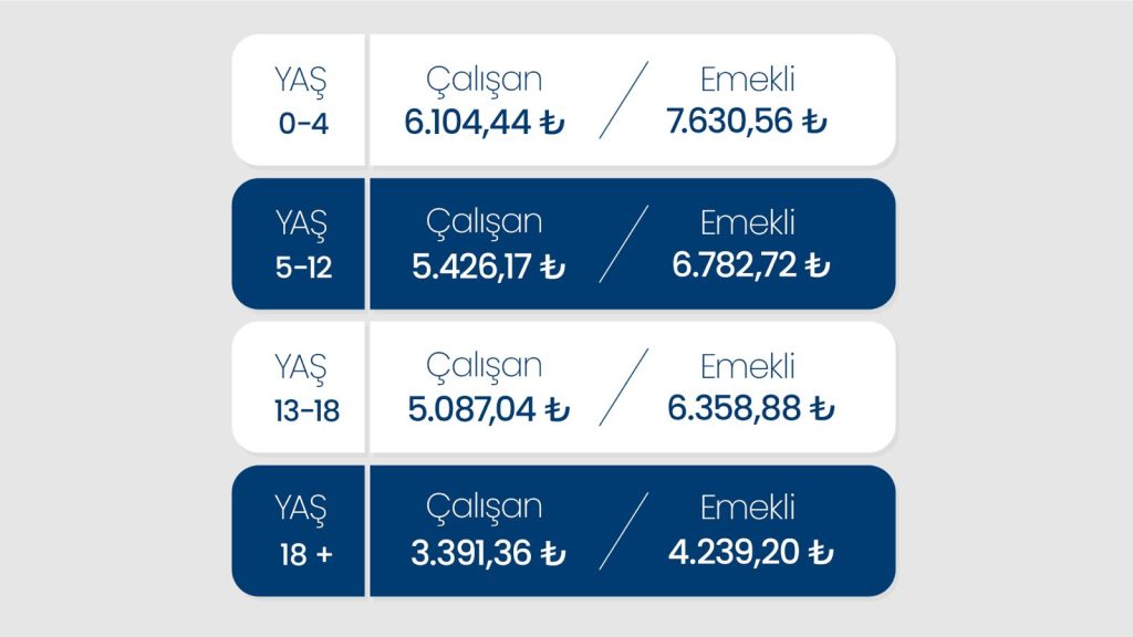 • 13-18 yaş için veli çalışıyor ise net 5.087,04 TL, veli emekli ise 6.358,88 TL